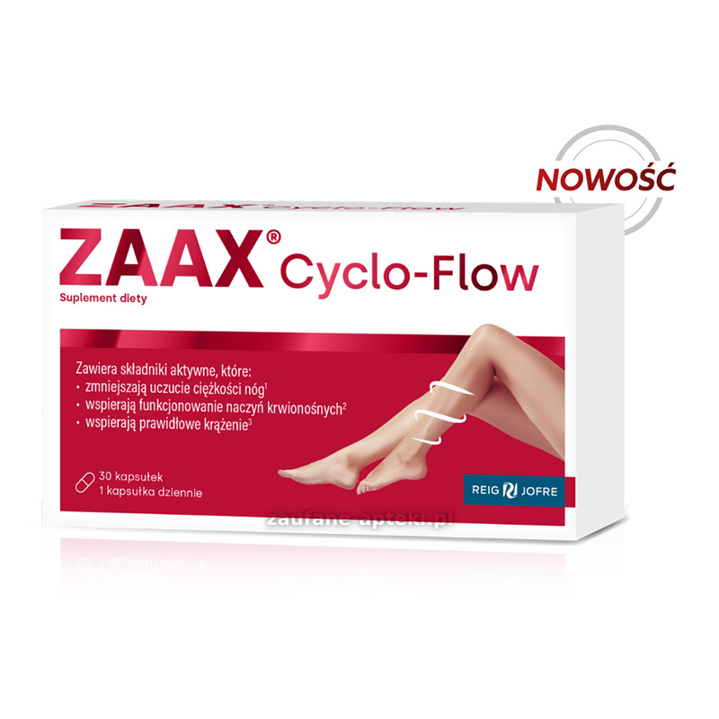 ZAAX Cyclo-Flow zawiera składniki aktywne, które wspierają funkcjonowanie naczyń krwionośnych i zmniejszają uczucie ciężkości nóg. ZAAX Cyclo-Flow polecany jest osobom dorosłym odczuwającym ciężkość i zmęczenie nóg oraz osobom, które prowadzą siedzący lub stojący tryb pracy i życia.